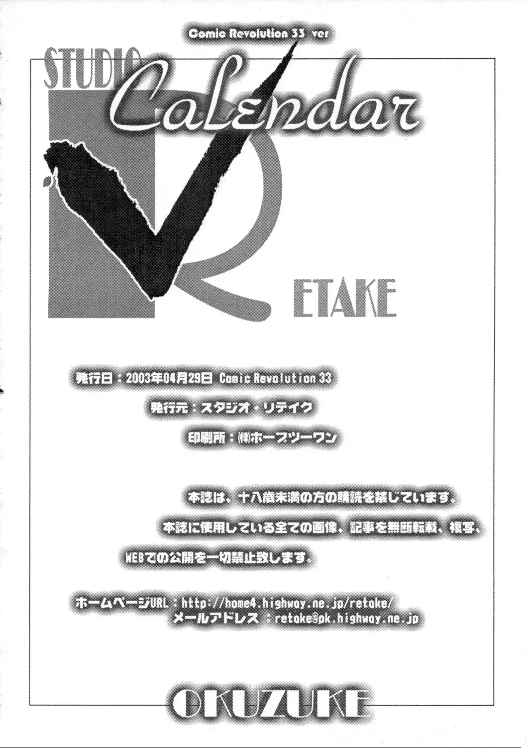 (CR33)[Studio Retake (Kobayashi Masakazu, Takimoto Satoru)] Calendar (Ashita no Nadja) (サンクリ33)[スタジオリテイク (小林正和, 滝本悟)] Calendar (明日のナージャ)