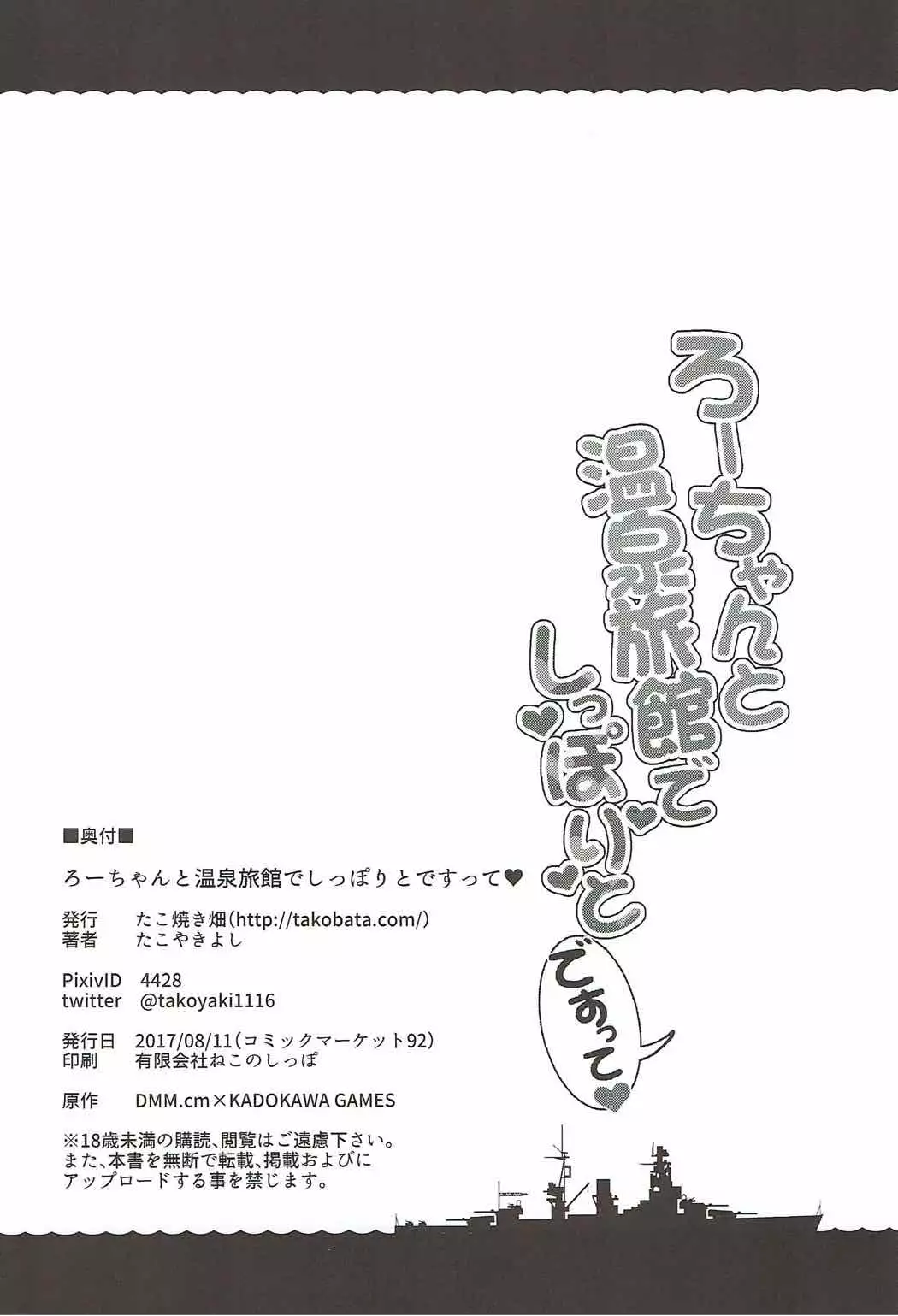 (C92) [Takoyaki-batake (Takoyaki Yoshi)] Ro-chan to Onsen Ryokan de Shippori to de Sutte (Kantai Collection -KanColle-) (C92) [たこ焼き畑 (たこやきよし)] ろーちゃんと温泉旅館でしっぽりとですって (艦隊これくしょん -艦これ-)