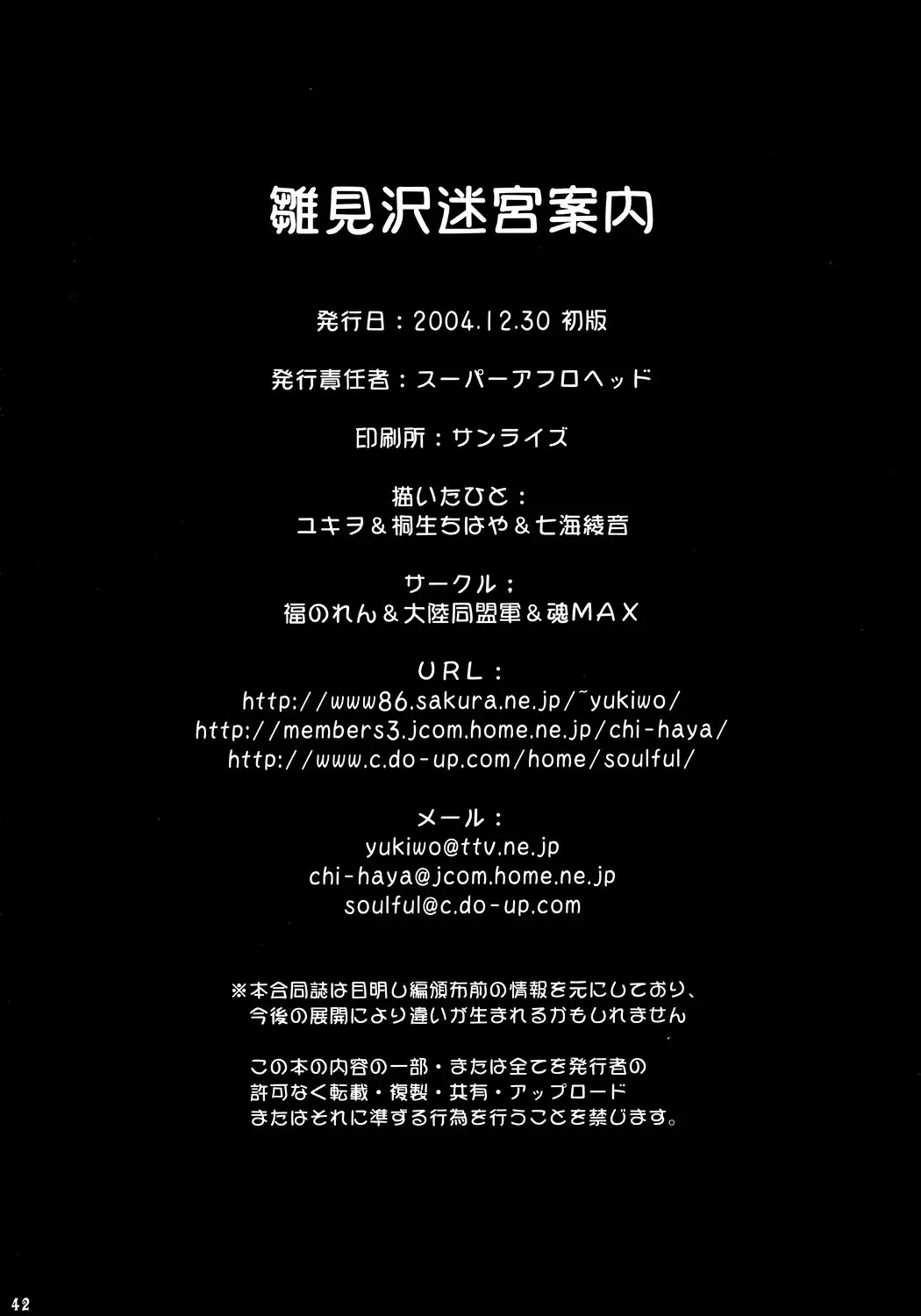 (C67) [Fukunoren, Tairikudoumeigun, Tamashii Max (Kiryuu Chihaya, Nanami Ayane, Yukiwo)] Hinamizawa Meikyuu Annai (Higurashi no Naku Koro ni) (C67) [福のれん, 大陸同盟軍, 魂MAX (桐生ちはや, 七海綾音, ユキヲ)] 雛見沢迷宮案内 (ひぐらしのなく頃に)