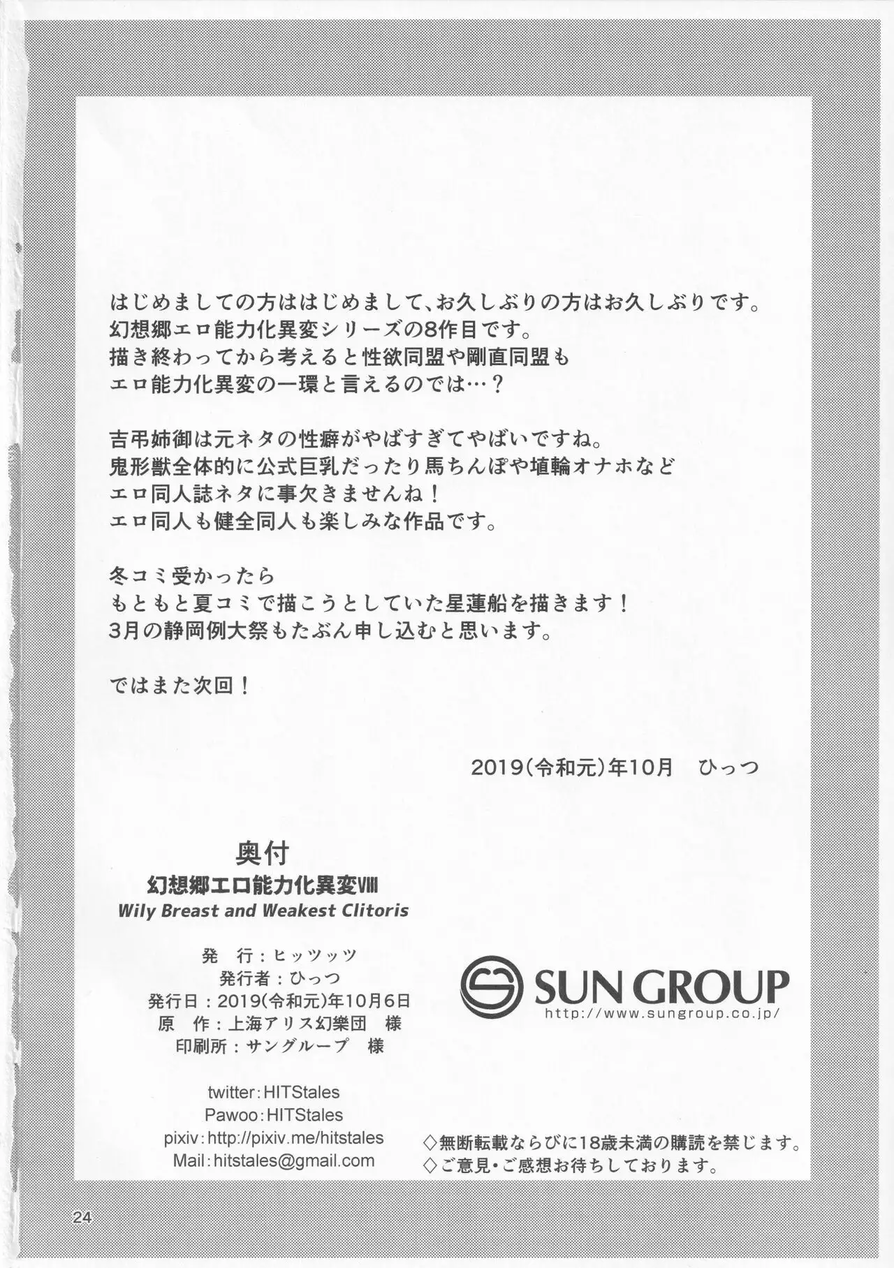 Gensoukyou Ero Nouryoku-ka Ihen VIII Wily Breast and Weakest Clitoris (秋季例大祭6) [ヒッツッツ (ひっつ)] 幻想郷エロ能力化異変Ⅷ Wily Breast and Weakest Clitoris (東方Project)