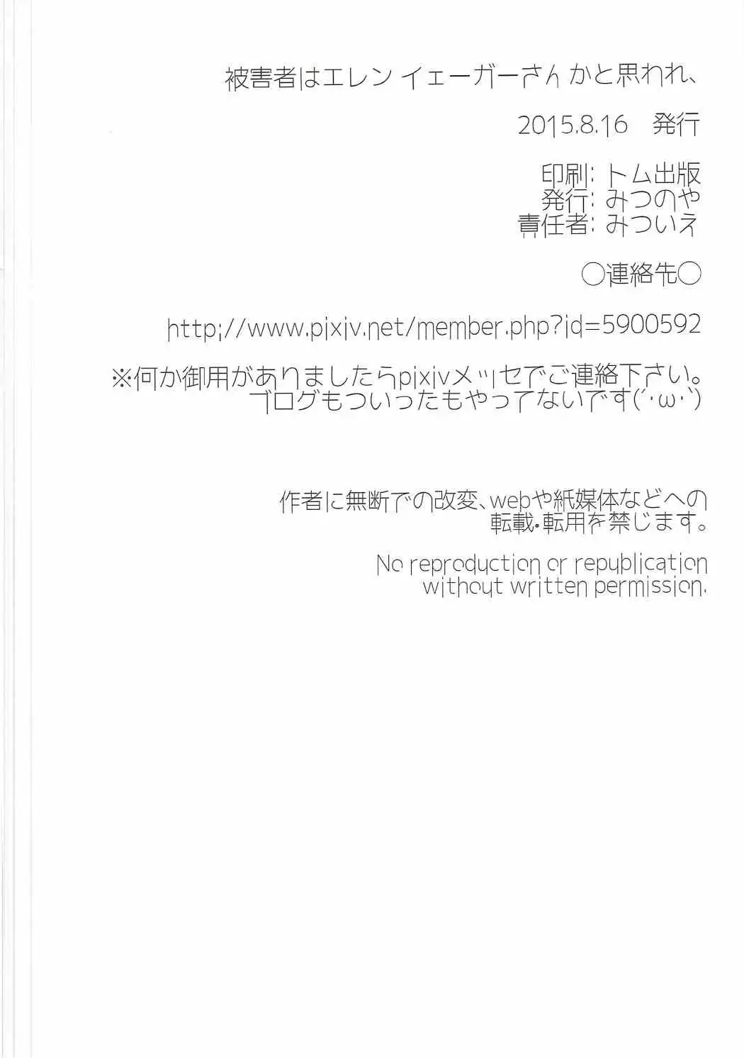 (C88) [Mitsunoya (Mitsuie)] Higaisha wa Eren Jaeger-san ka to Omoware, (Shingeki no Kyojin) (C88) [みつのや (みついえ)] 被害者はエレンイェーガーさんかと思われ、 (進撃の巨人)